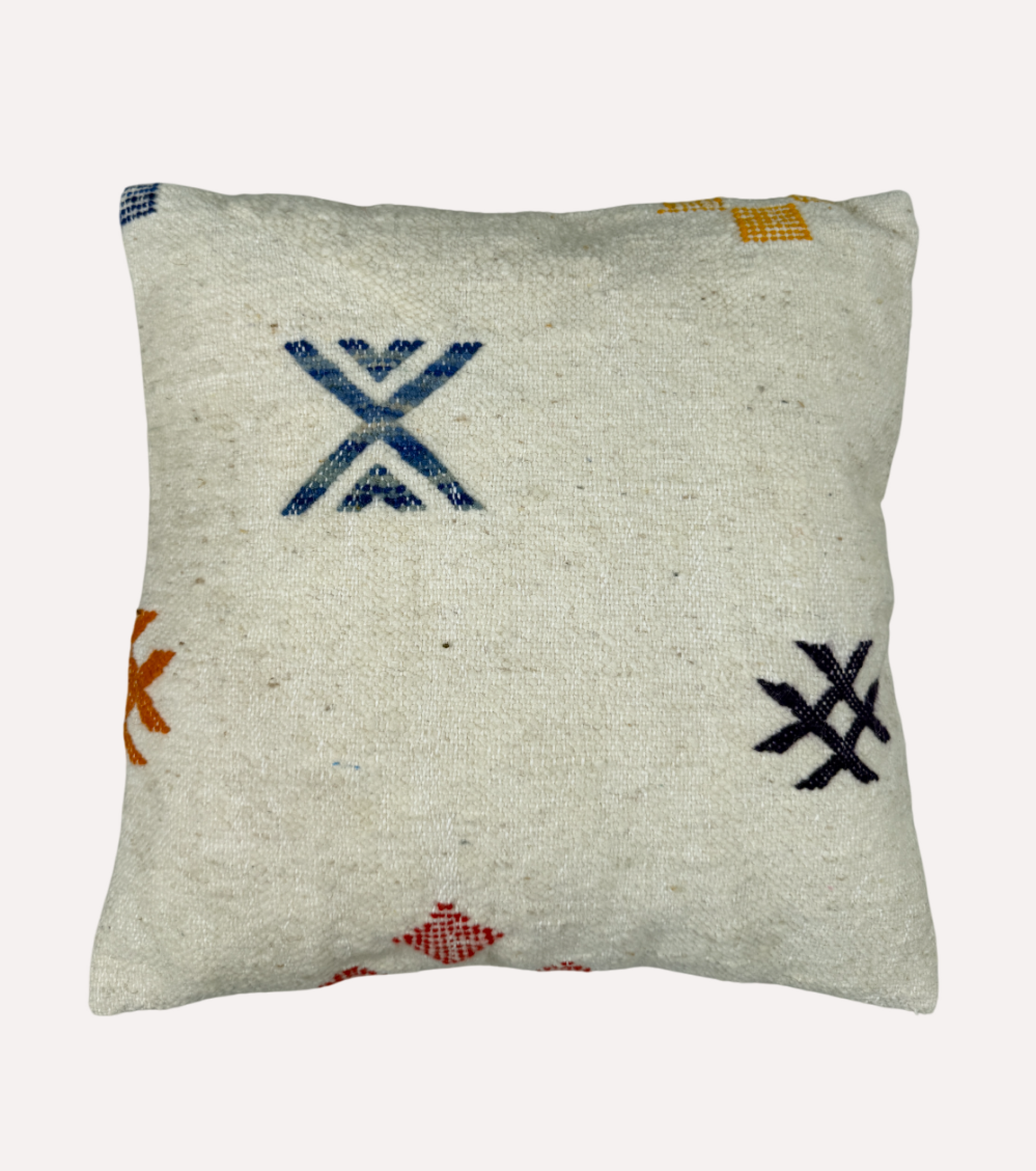 • Dat verschilt per type kussen! Berber kussens worden gemaakt van vintage Beni Ouarain of Boujaad kleden. Deze zijn gemaakt van 100% wol. Kelim kussens zijn ook gemaakt van wol, maar voelen wat meer stevig aan. Sabra kussens, ook wel cactuszijde kussens genoemd, worden gemaakt van vezels van de agaveplant. Ze worden met de hand geverfd in verschillende zachte tinten.
