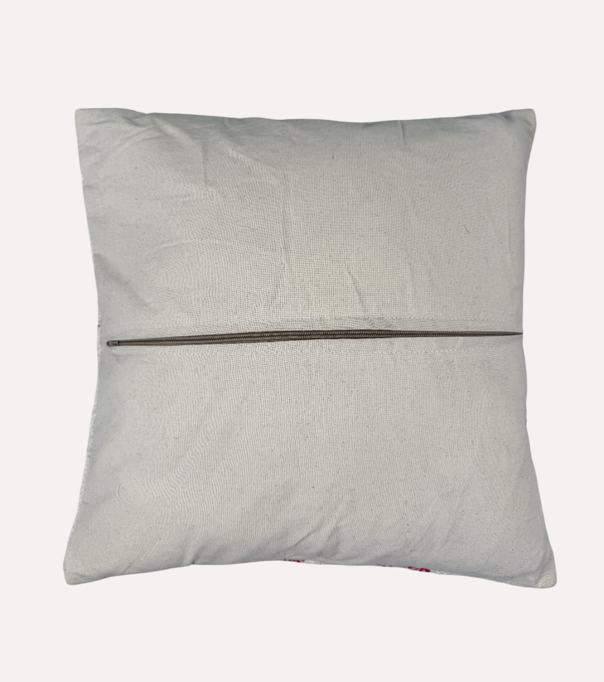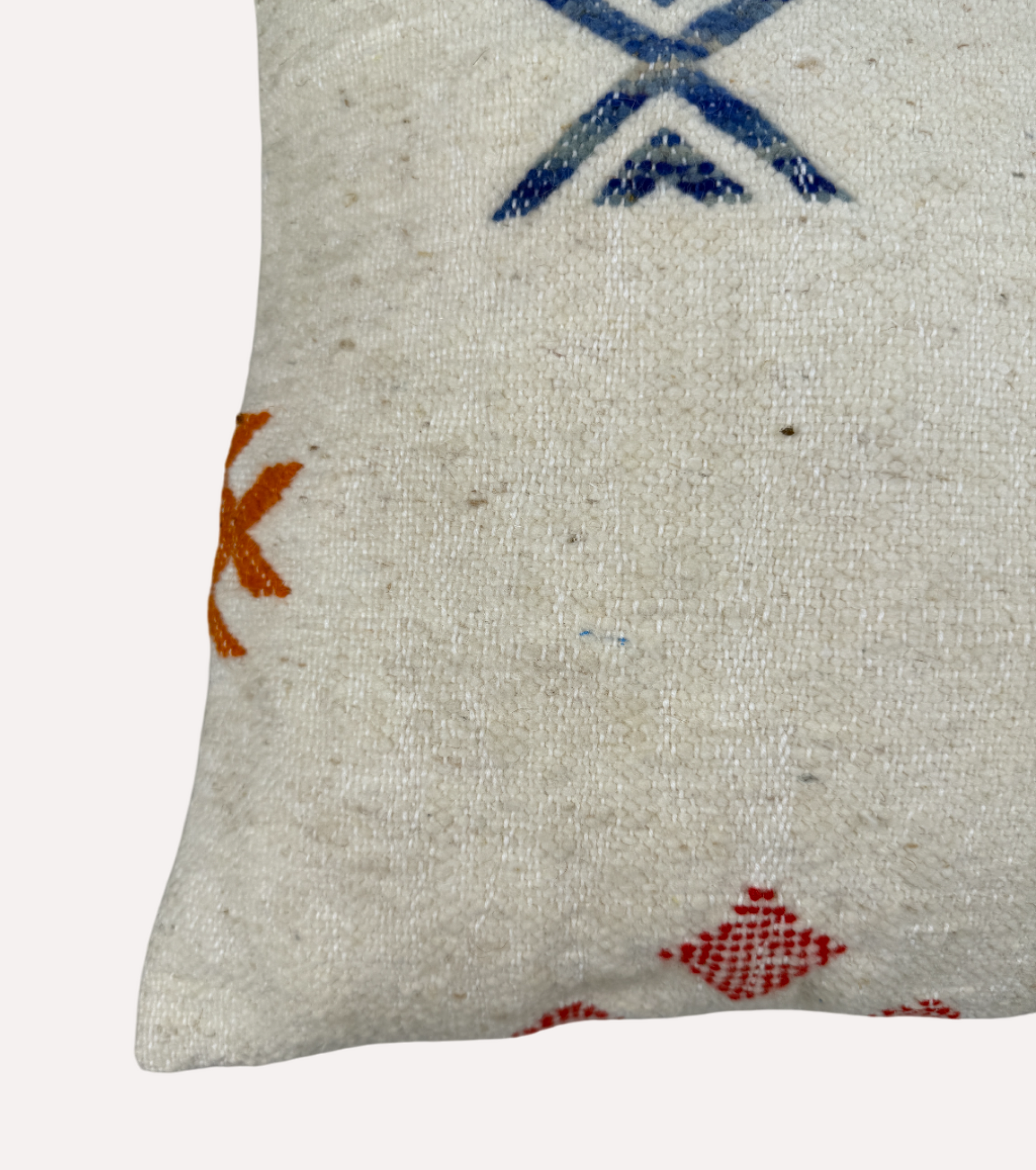 Subtiel met een verhaal. Dit handgeweven Marokkaanse kussen is gemaakt van naturel katoen en versierd met traditionele Amazigh symbolen in blauw, zwart, oker en rood. De rustige basis zorgt voor balans, terwijl de kleurrijke borduursels een vleugje cultuur en symboliek toevoegen.