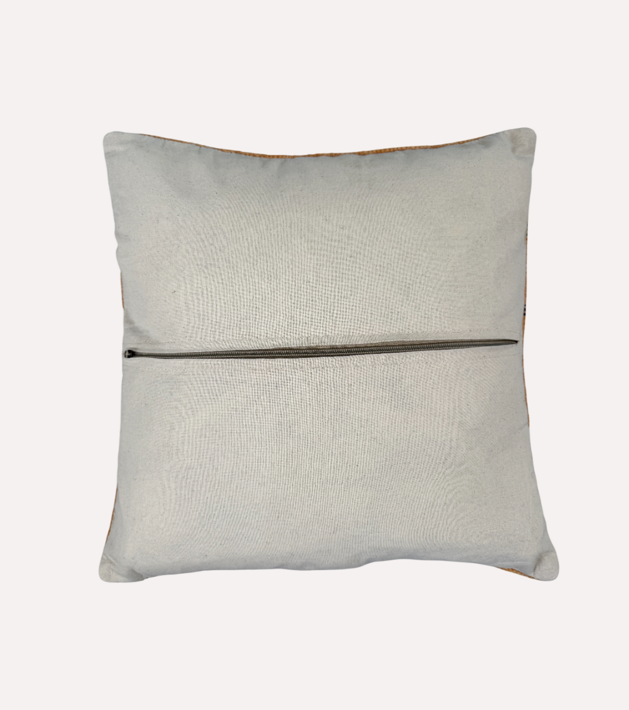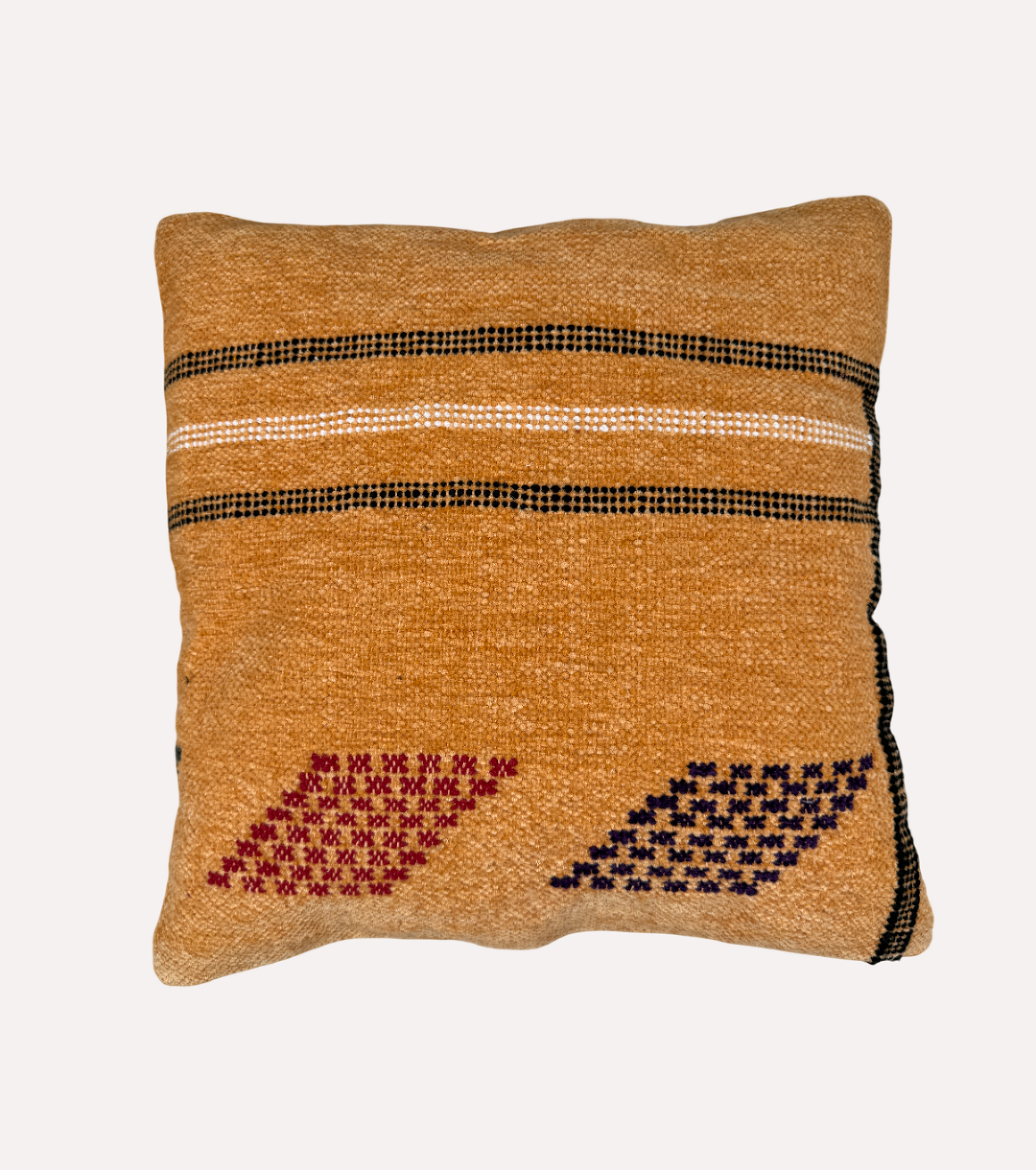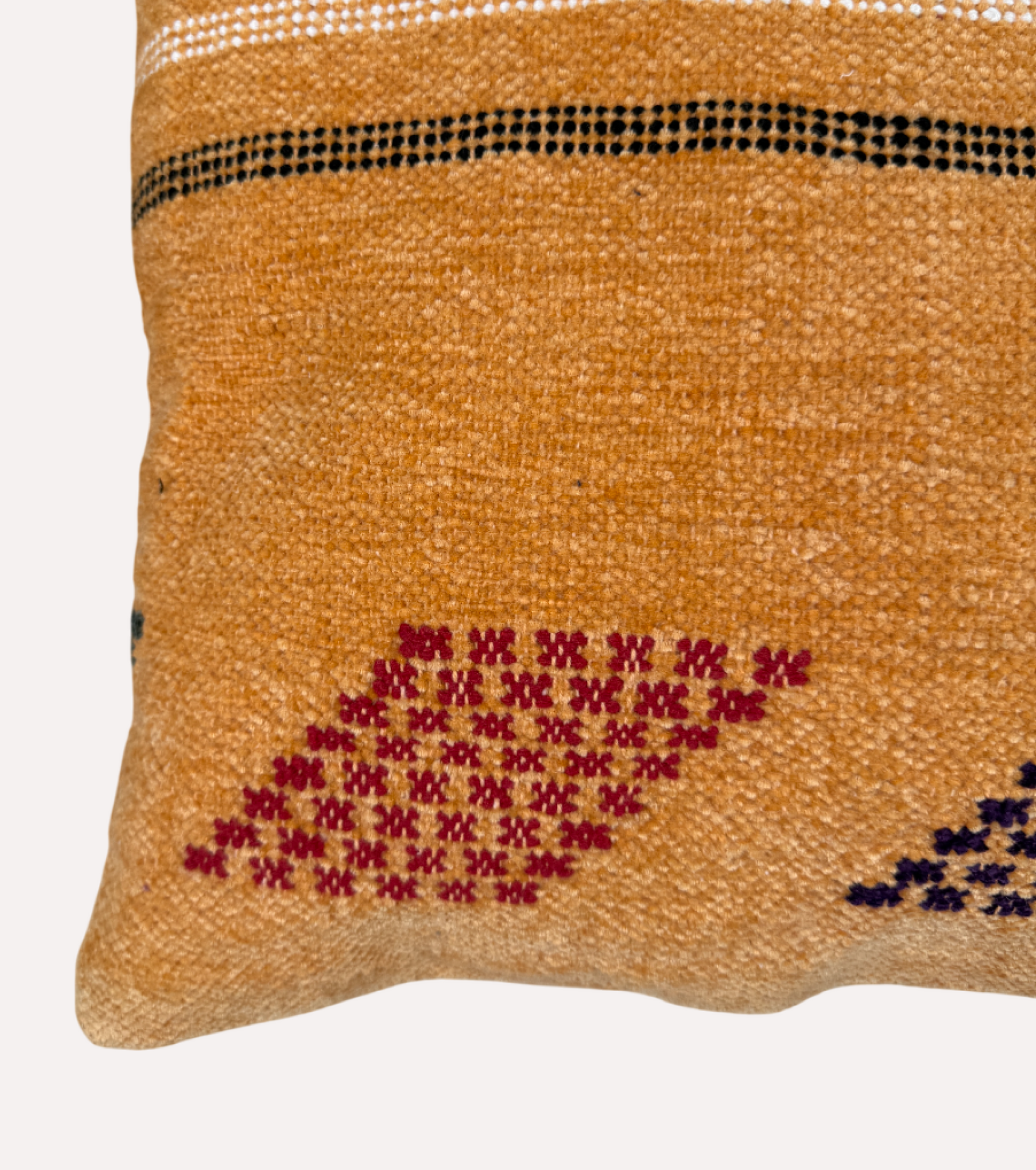 Aards en authentiek. Dit Marokkaanse kussen is handgeweven van een vintage kelim in warme karameltint, met zwarte strepen en fijne Amazigh symbolen in bordeaux en diepblauw. De grafische details zorgen voor een mooi contrast en maken elk kussen uniek.