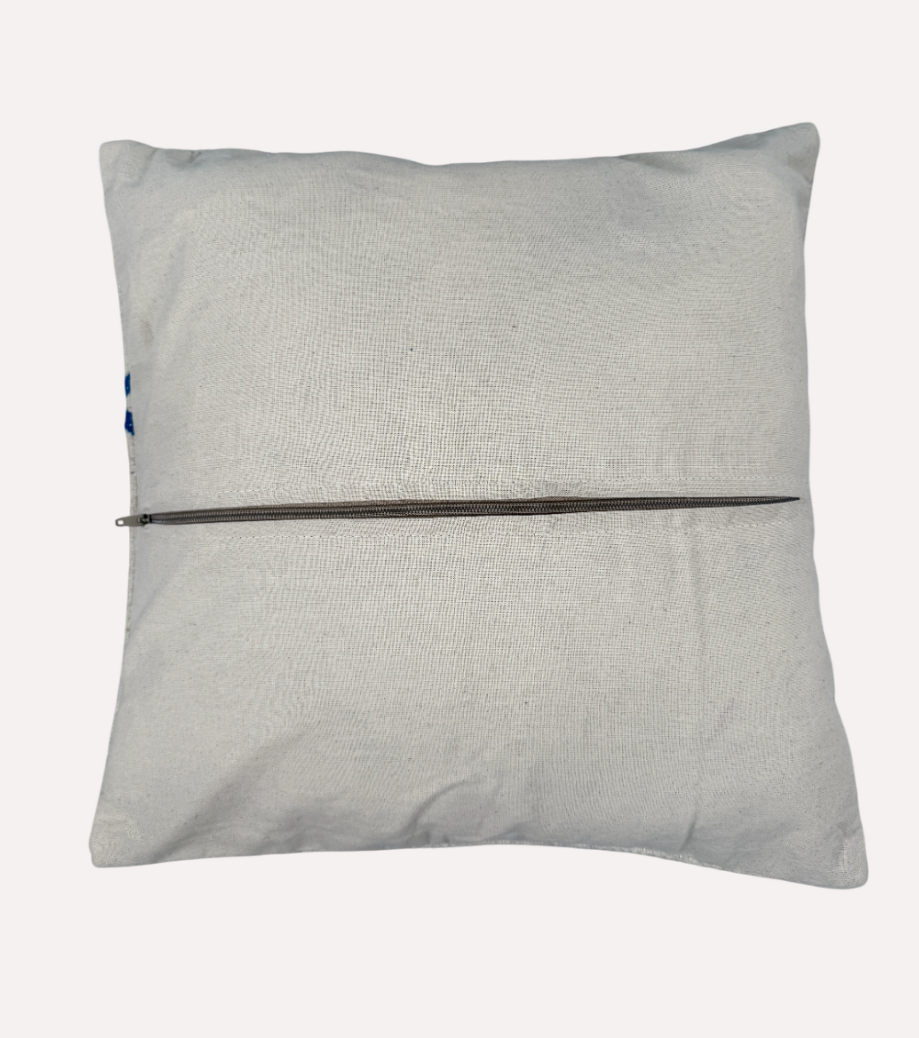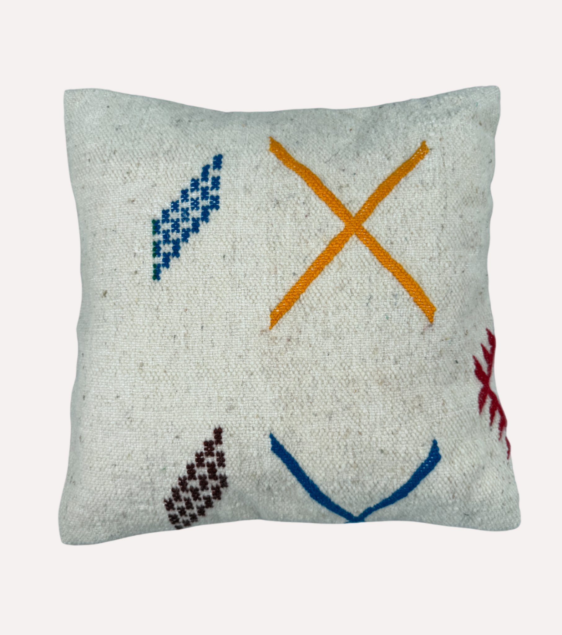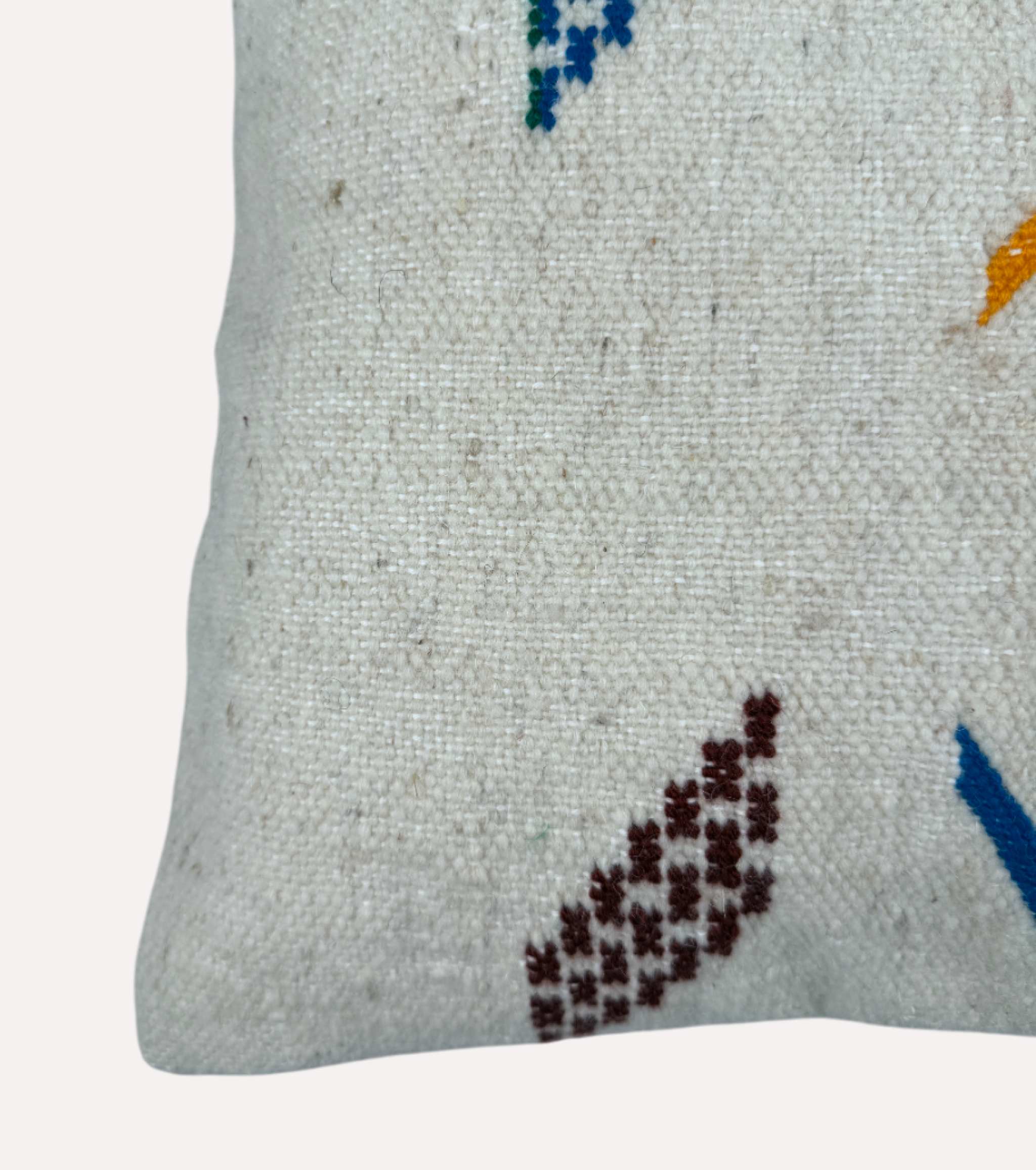 Licht, luchtig en vol symboliek. Dit Marokkaanse kussen is geweven van naturel katoen en versierd met kleurrijke Amazigh motieven in blauw, okergeel, rood, bordeaux en groen. De zachte crèmekleurige basis laat de borduursels echt tot leven komen en zorgt voor een rustige uitstraling met een speels randje.