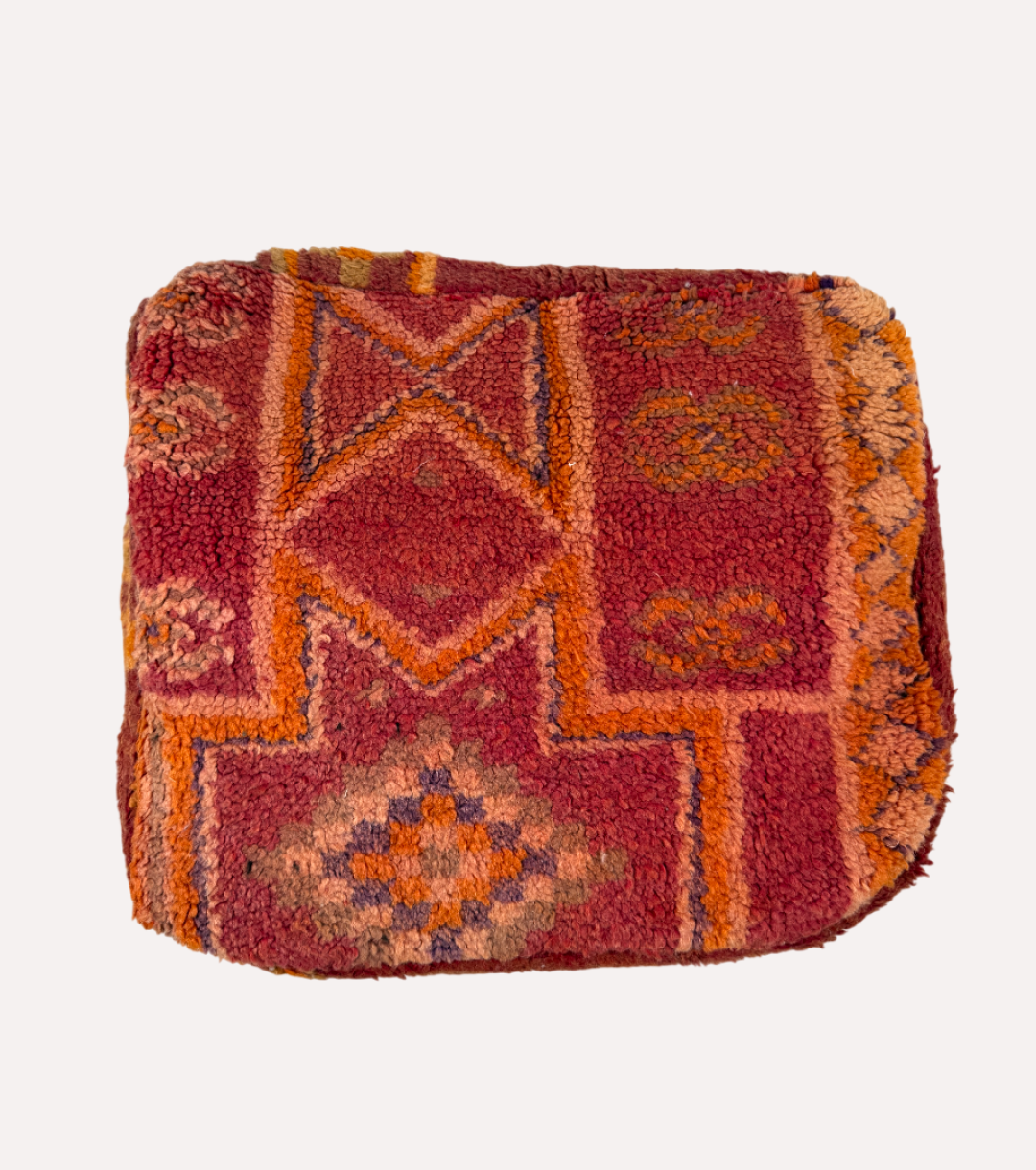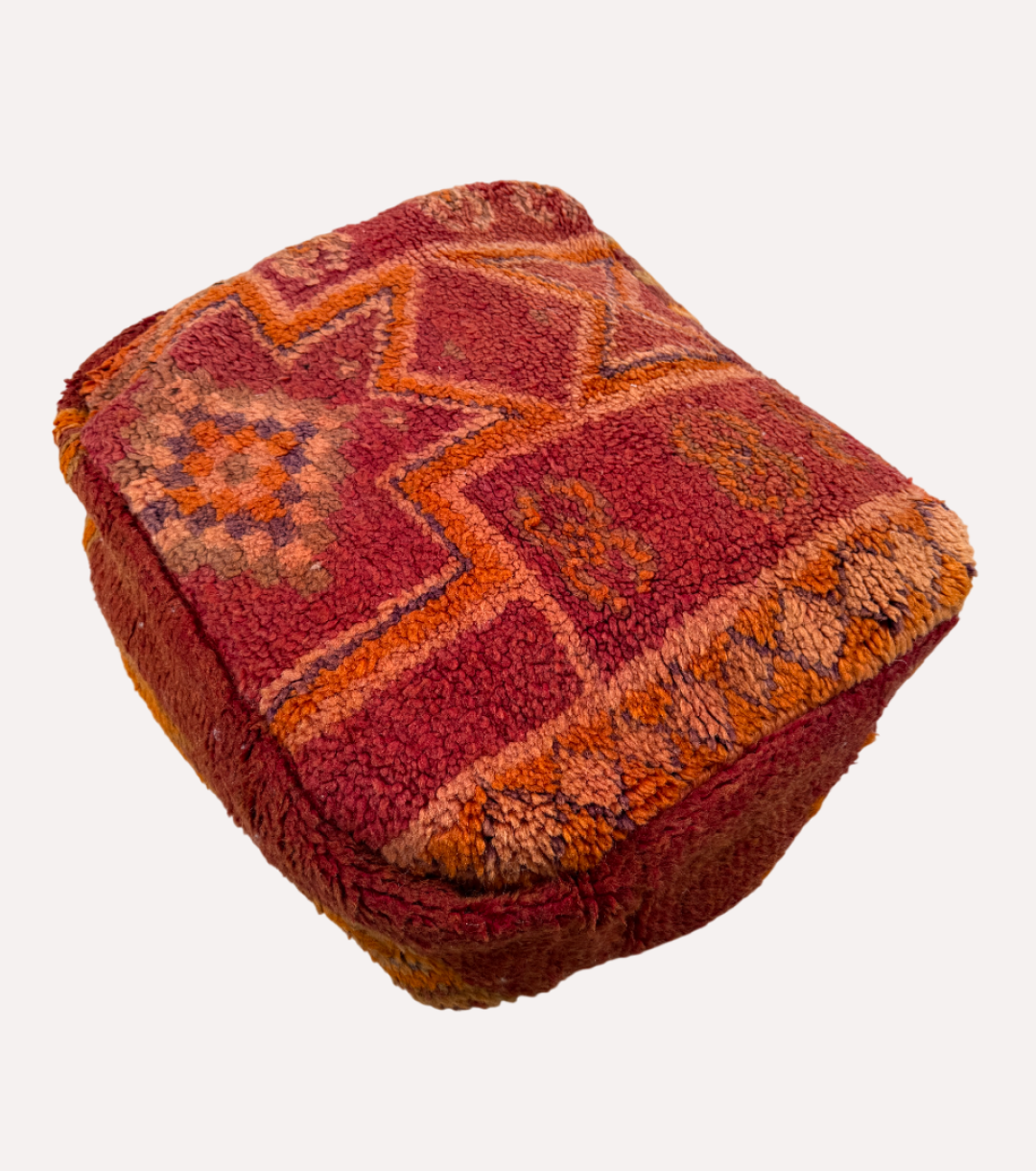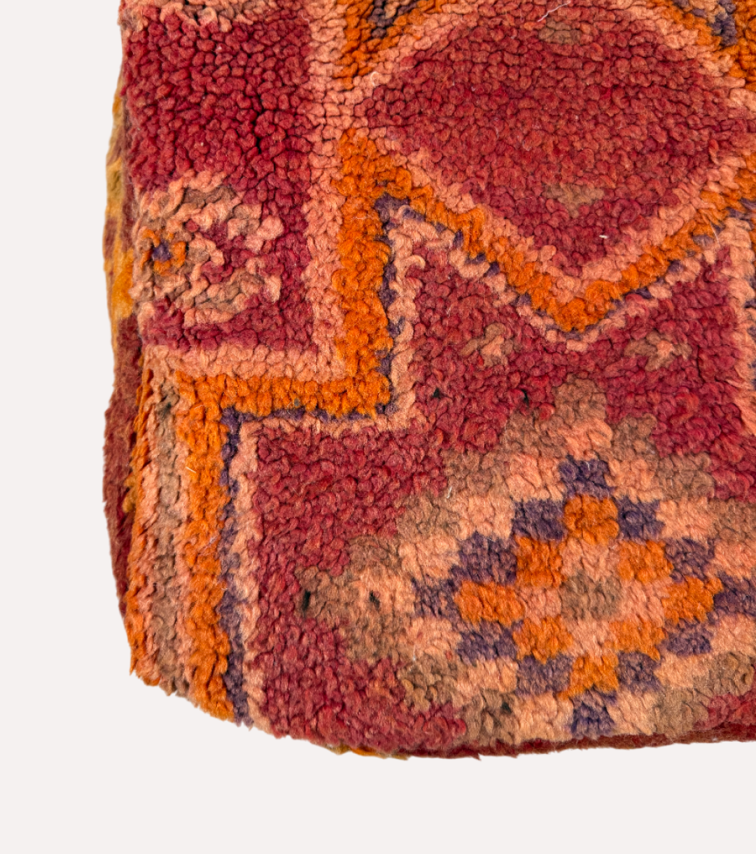 Oosterse warmte in een vierkant jasje – deze Marokkaanse poef is vintage vibes met een twist. Gemaakt van een oud berbertapijt en handgemaakt in Marokko, combineert dit stuk diepe roest- en oranjetinten met geometrische patronen vol karakter.