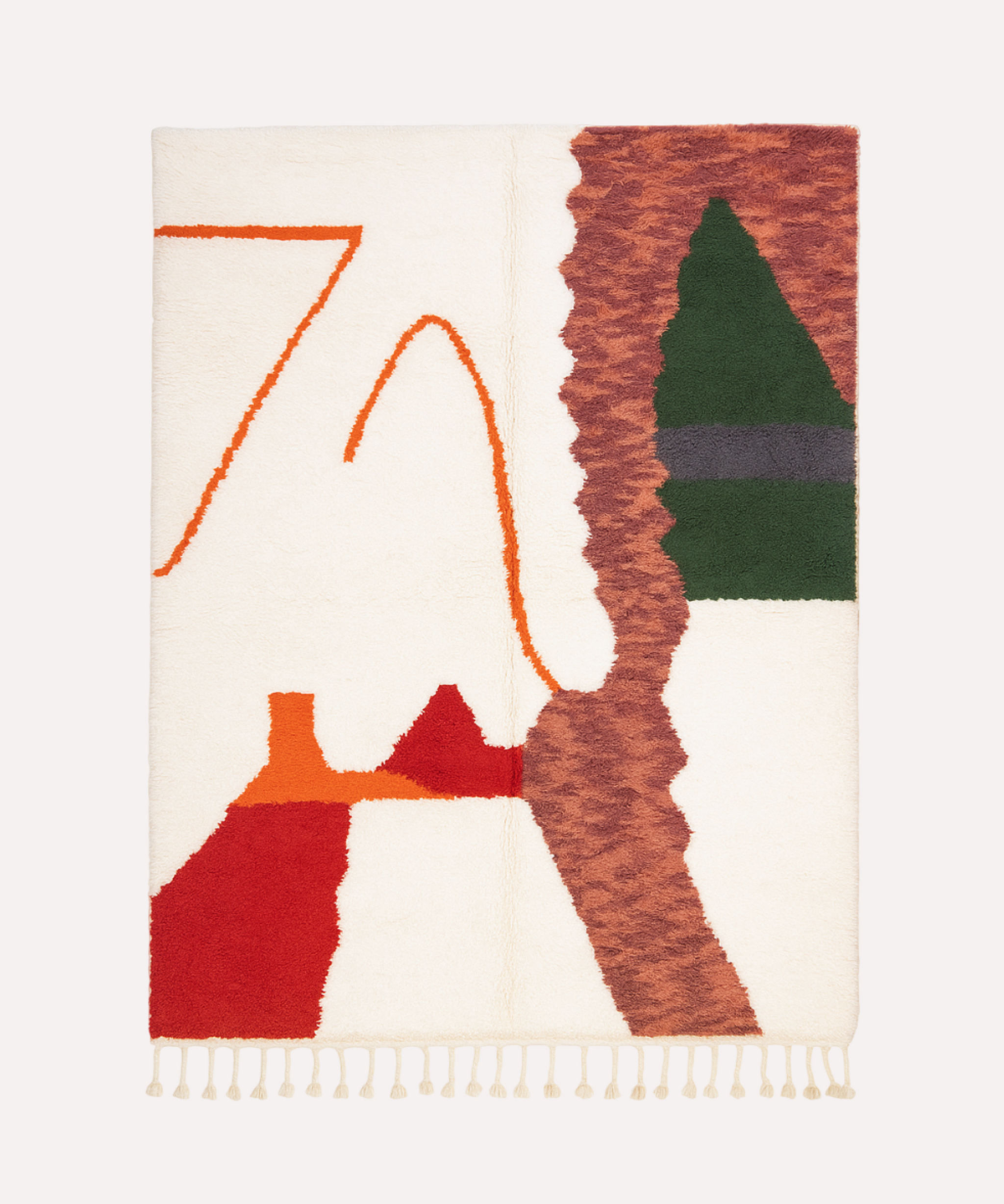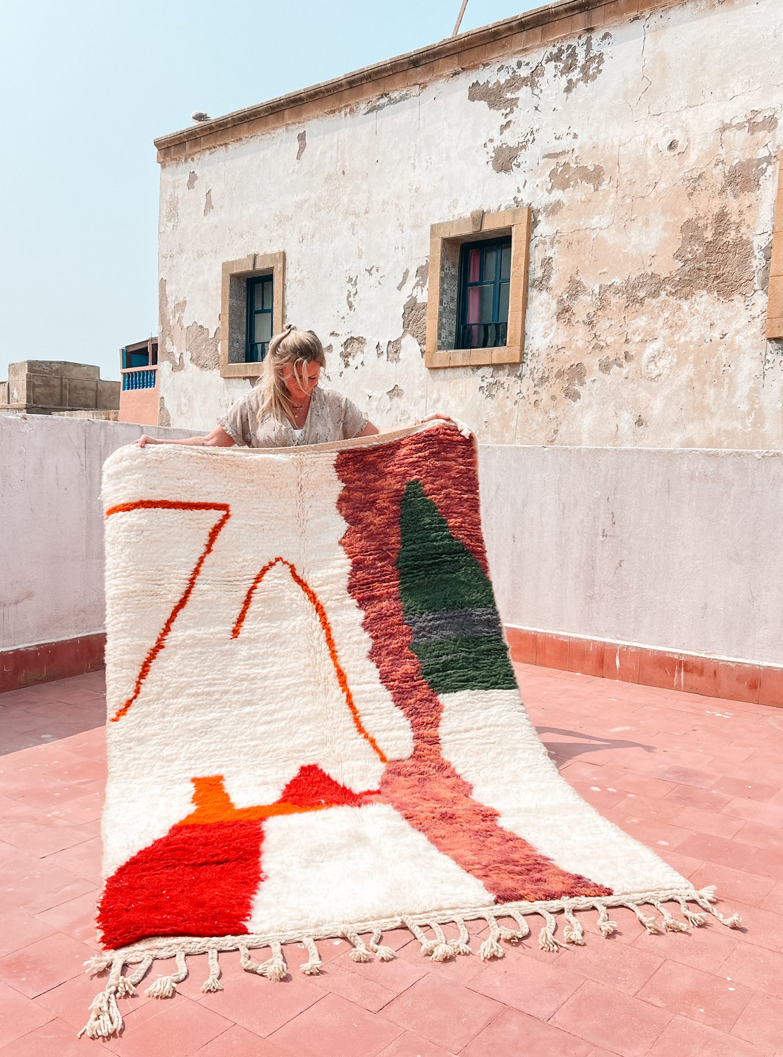 Minimalistisch én expressief, Sora combineert een rustige crèmekleurige basis met abstracte vormen in warme rood-, groen- en oranjetinten. Het ontwerp voelt eigentijds aan, maar draagt tegelijkertijd de ziel van traditioneel Berbers vakmanschap. Het speelse lijnenspel en de kleurvlakken geven jouw ruimte direct een artistieke en warme sfeer.