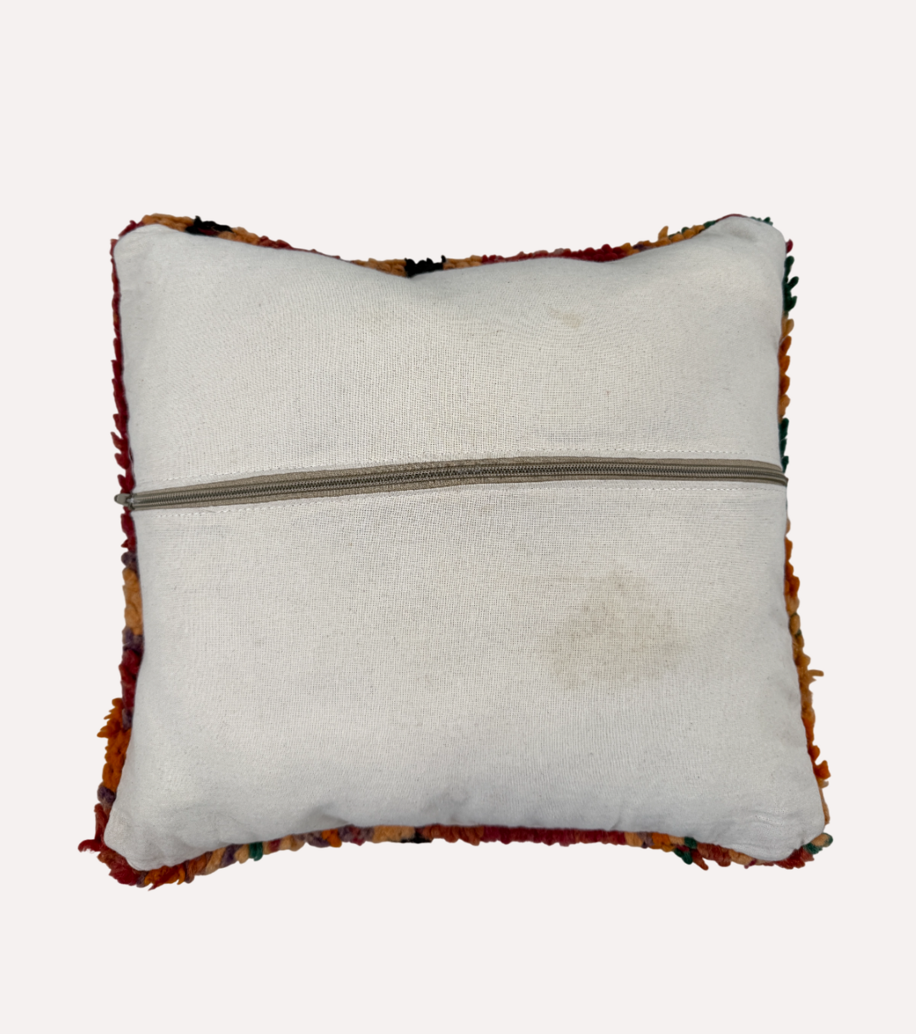 Zacht, stoer en vol kleur. Dit Marokkaanse kussen is gemaakt van een vintage berbertapijt en barst van karakter. De diepe tinten rood, oker, paars en groen zorgen voor een rijke uitstraling met een speels patroon dat met de hand is geknoopt. De wollige textuur geeft het kussen een knusse en robuuste look.
