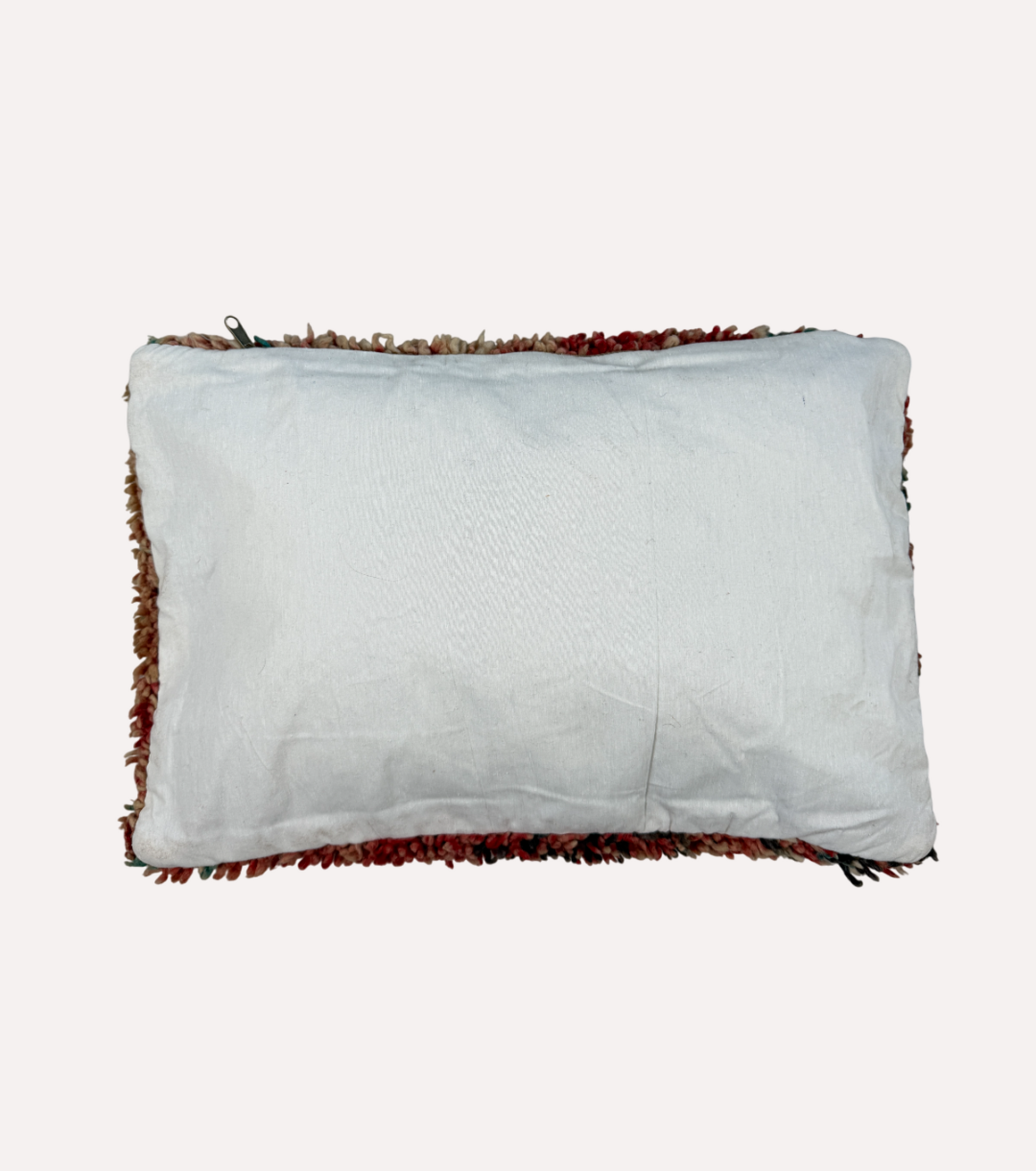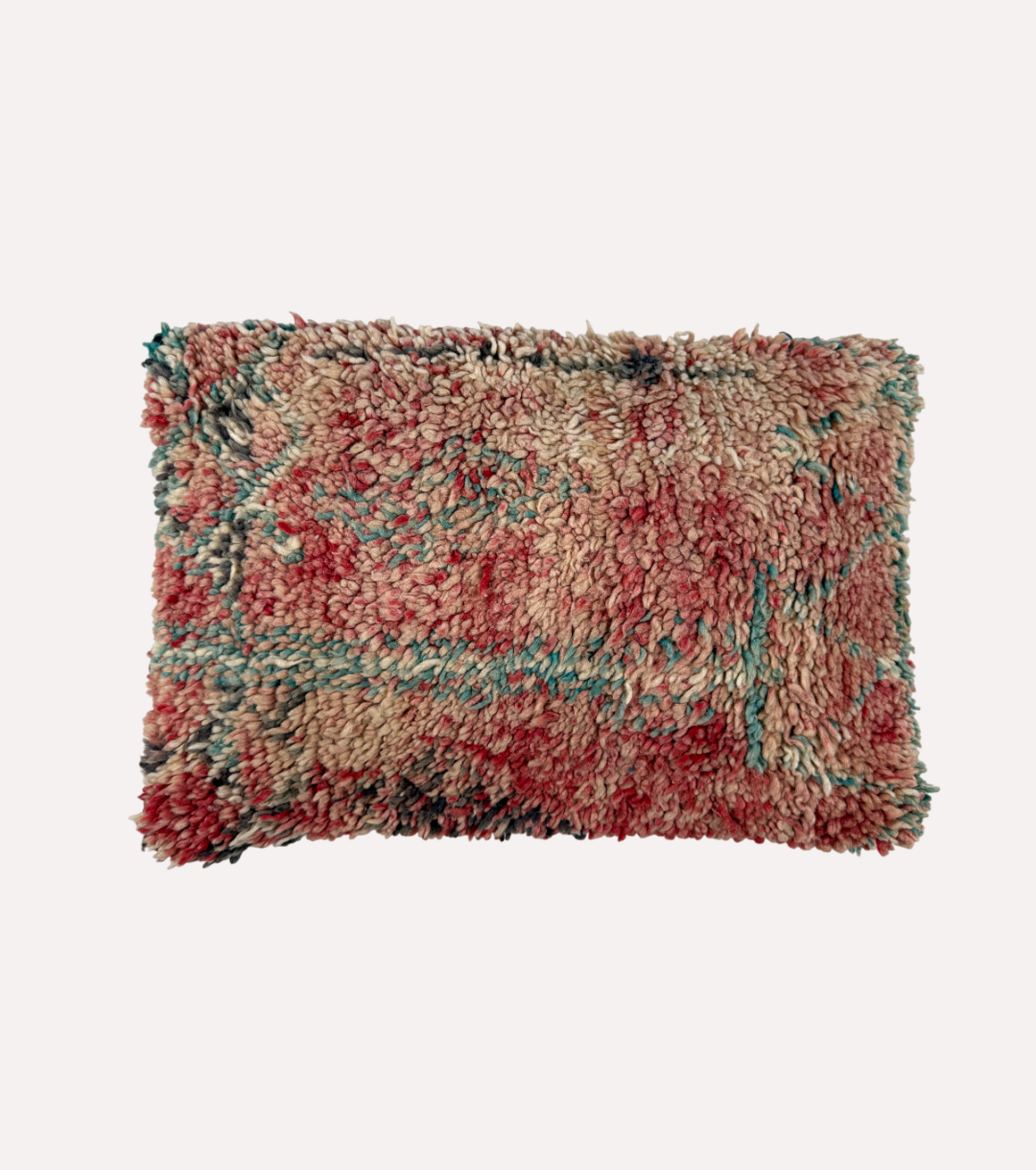 Dit Marokkaanse Boucherouite kussen is een mix van oud textiel, zachte wol en vrolijke kleuren. De tinten roze, turquoise en zand vloeien moeiteloos in elkaar over en geven het kussen een levendig maar rustgevend karakter.