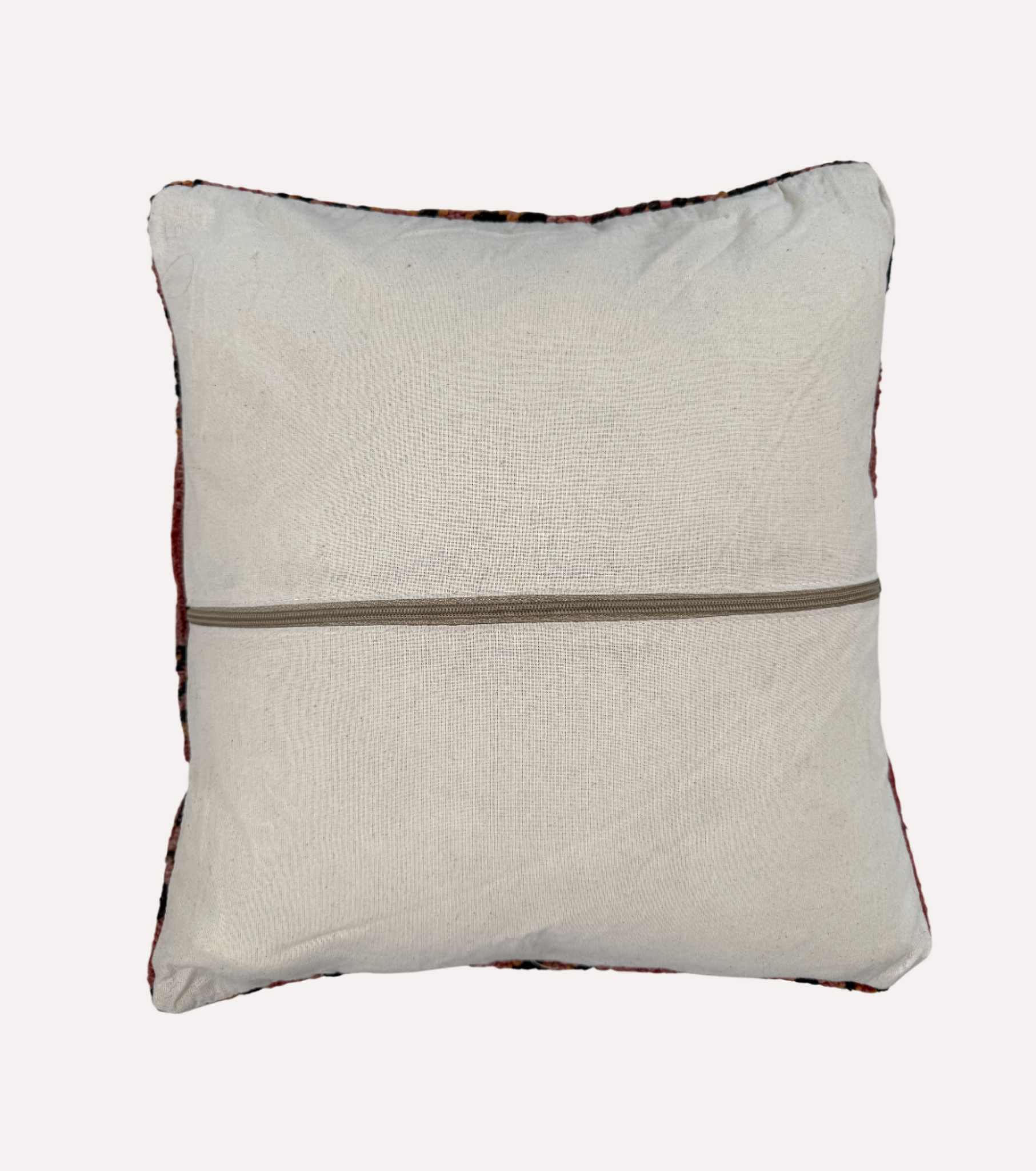 Rijk gedetailleerd en warm van kleur. Dit handgemaakte Marokkaanse kussen is gemaakt van een vintage tapijt in diepe roze tinten, versierd met grafische patronen in zwart, mosterdgeel en zachtroze. De traditionele motieven lopen in verticale banen over het kussen en zorgen voor een uniek ritme in het ontwerp.