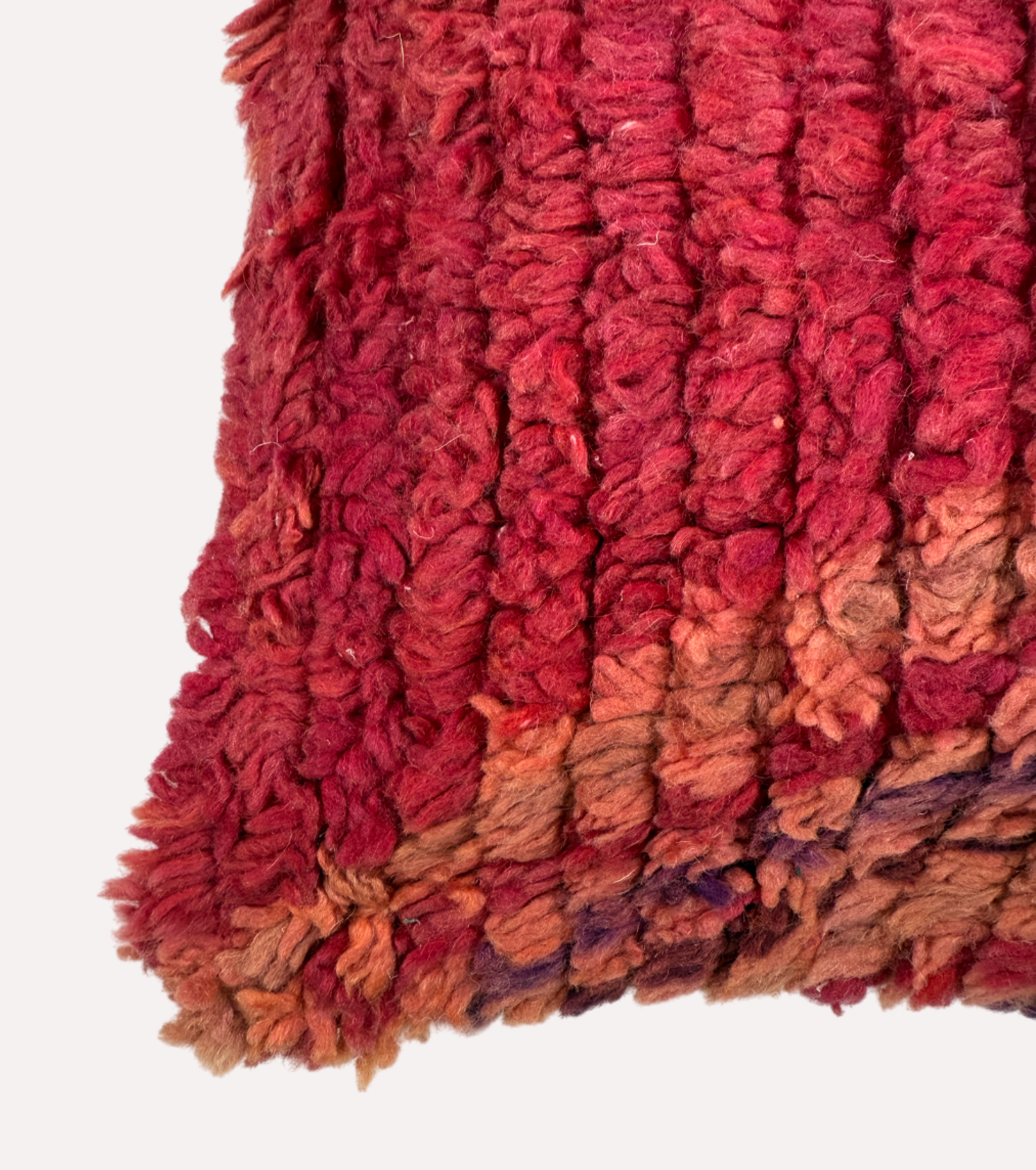 Zacht, speels en boordevol karakter. Dit kussen is gemaakt van een vintage Boucherouite tapijt en straalt één en al warmte uit. De kleuren lopen van robijnrood naar aubergine, oudroze en vleugjes paars — als een Marokkaanse zonsondergang in textiel.