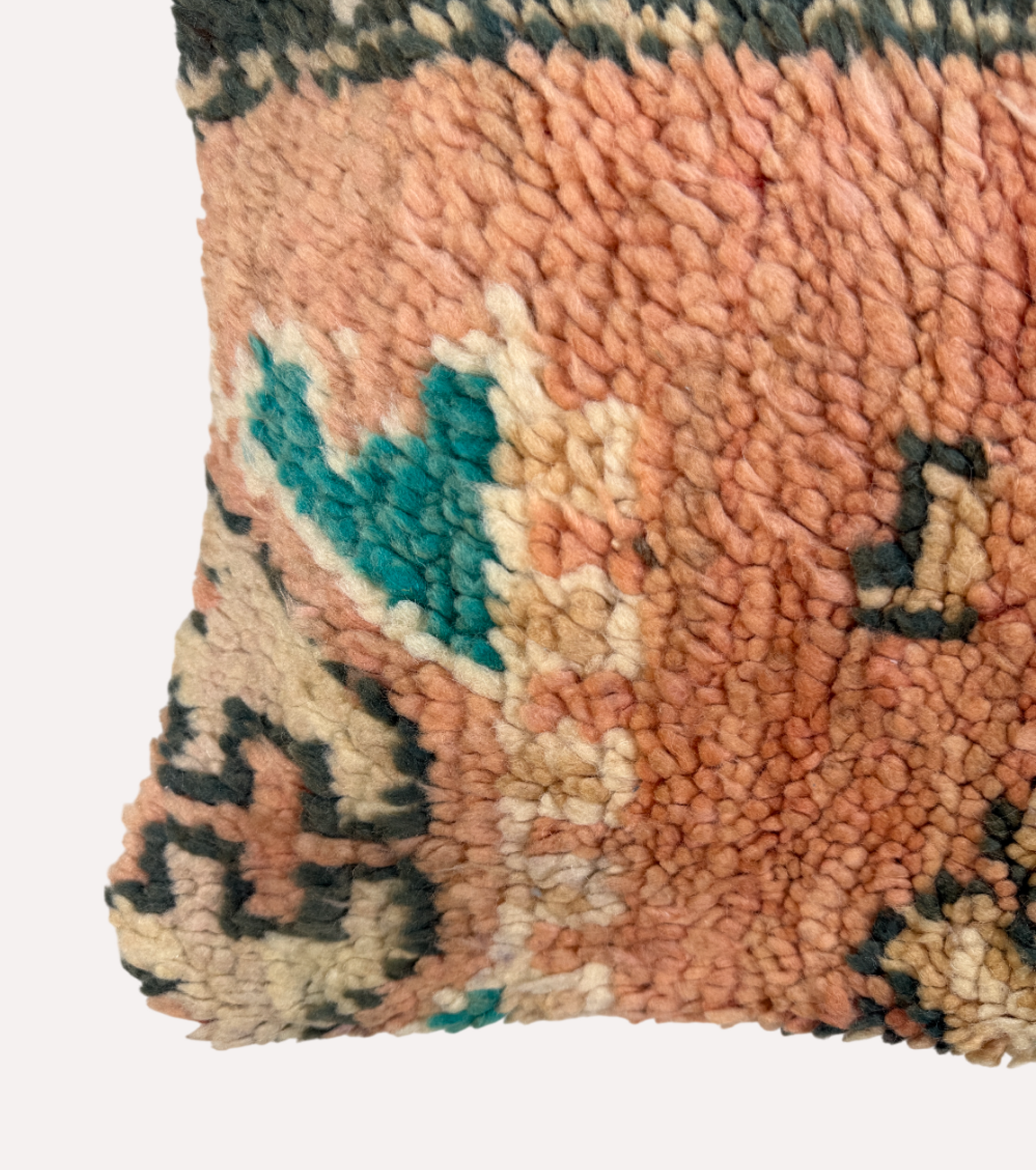 Zacht, kleurrijk en met een vleugje vintage charme. Dit handgemaakte Boucherouite kussen is vervaardigd uit een hergebruikt tapijt uit Marokko. De warme perzikkleur vormt een prachtige basis voor de geometrische details in zwart, turquoise en crème.
