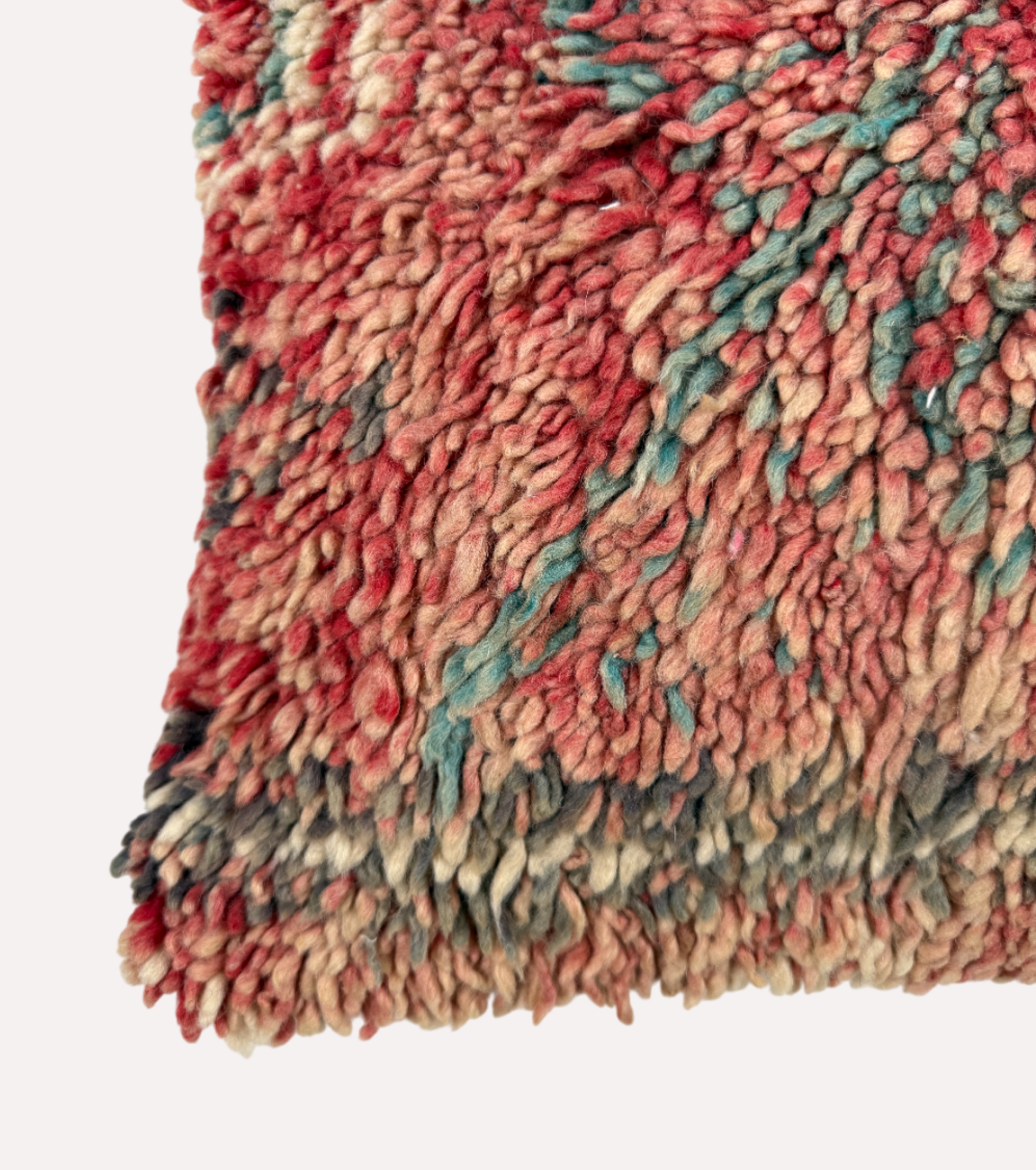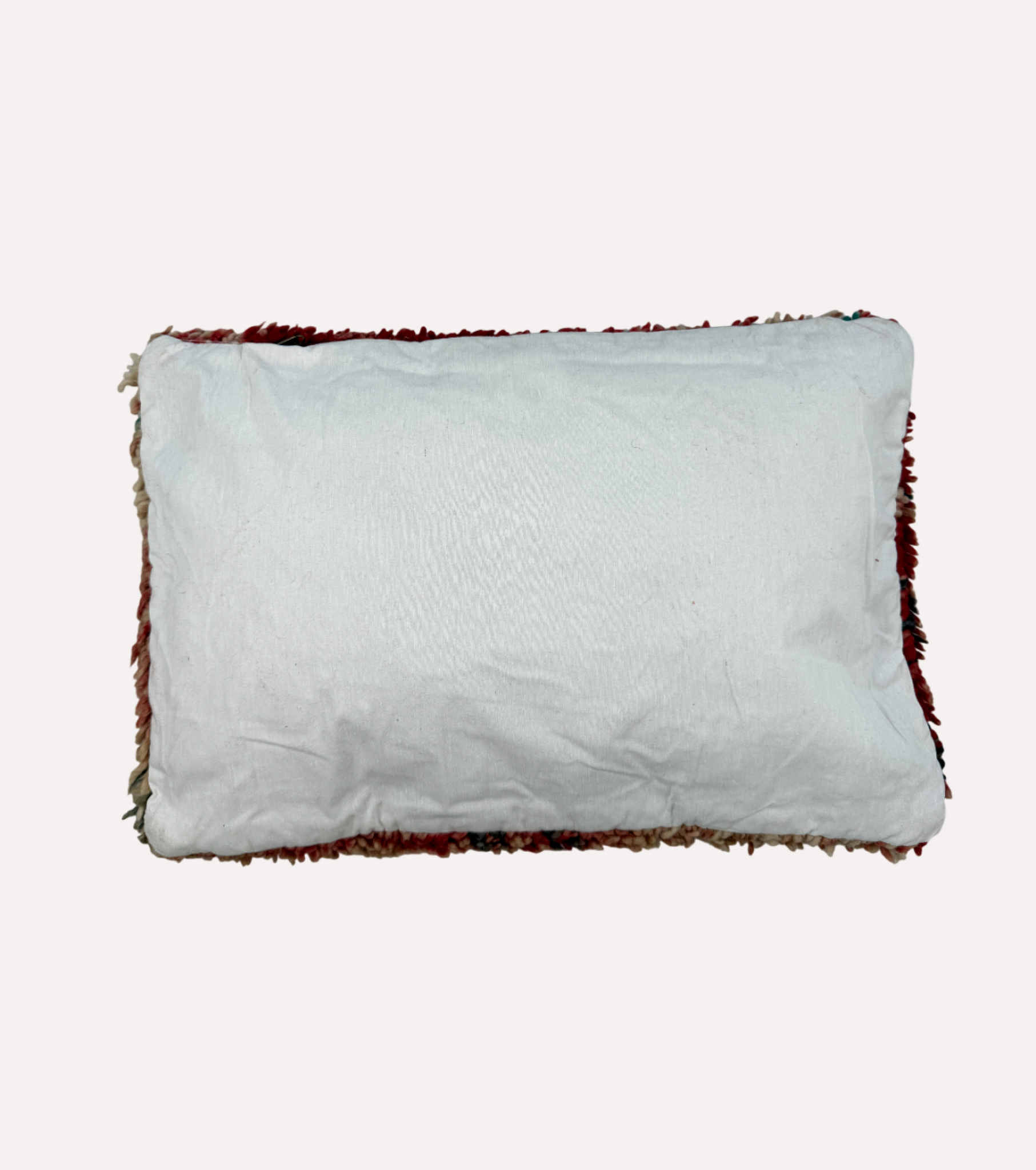 Zacht, eigenzinnig en helemaal uniek. Dit kussen is gemaakt van een vintage Boucherouite tapijt, met een warme mix van roestrood, zand, turquoise en donkergrijs. De grove, pluizige textuur nodigt uit tot wegzakken — het is comfort met een vleugje Marokkaans erfgoed.