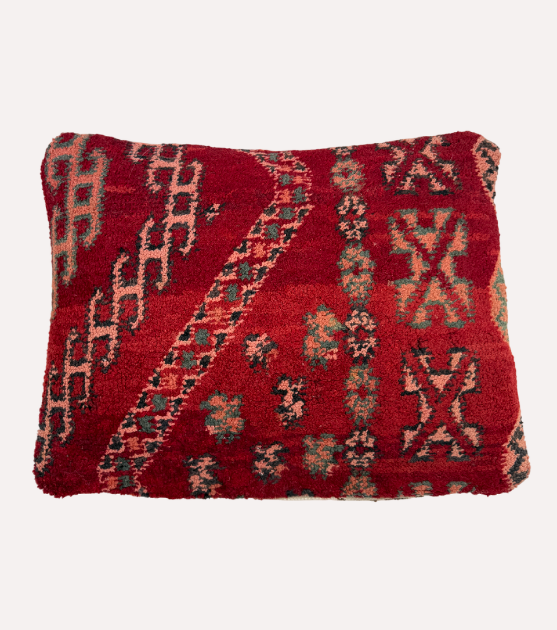 Diep rood en vol traditie. Dit Marokkaanse kussen is gemaakt van een vintage tapijt en toont klassieke Amazigh motieven in rood, donkergroen, roze en zwart. De levendige kleur en verfijnde patronen geven het kussen een krachtige uitstraling, terwijl de zachte wolstructuur zorgt voor comfort.