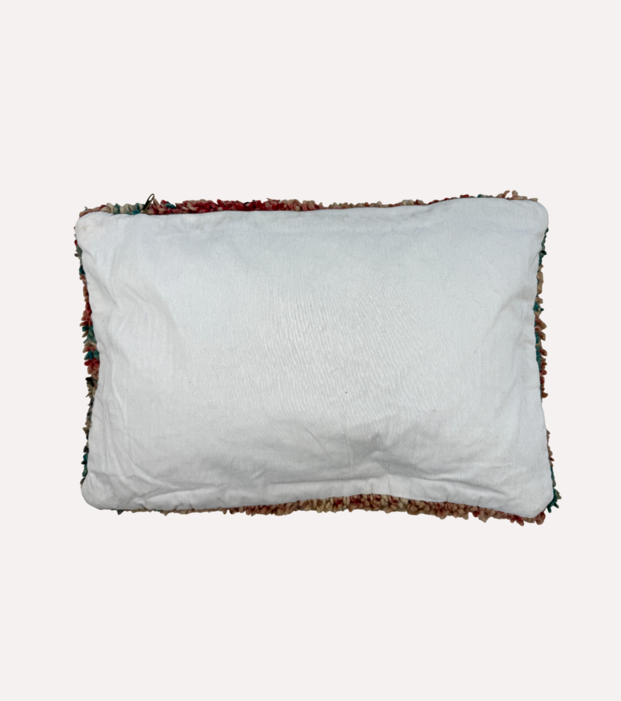 Zacht, speels en vol karakter. Dit handgemaakte kussen is gemaakt van een vintage Boucherouite tapijt — een mix van traditie en creativiteit uit het hart van Marokko. De combinatie van zandkleurige wol, warme roesttonen en fris turquoise geeft het kussen een levendig maar rustgevend karakter.