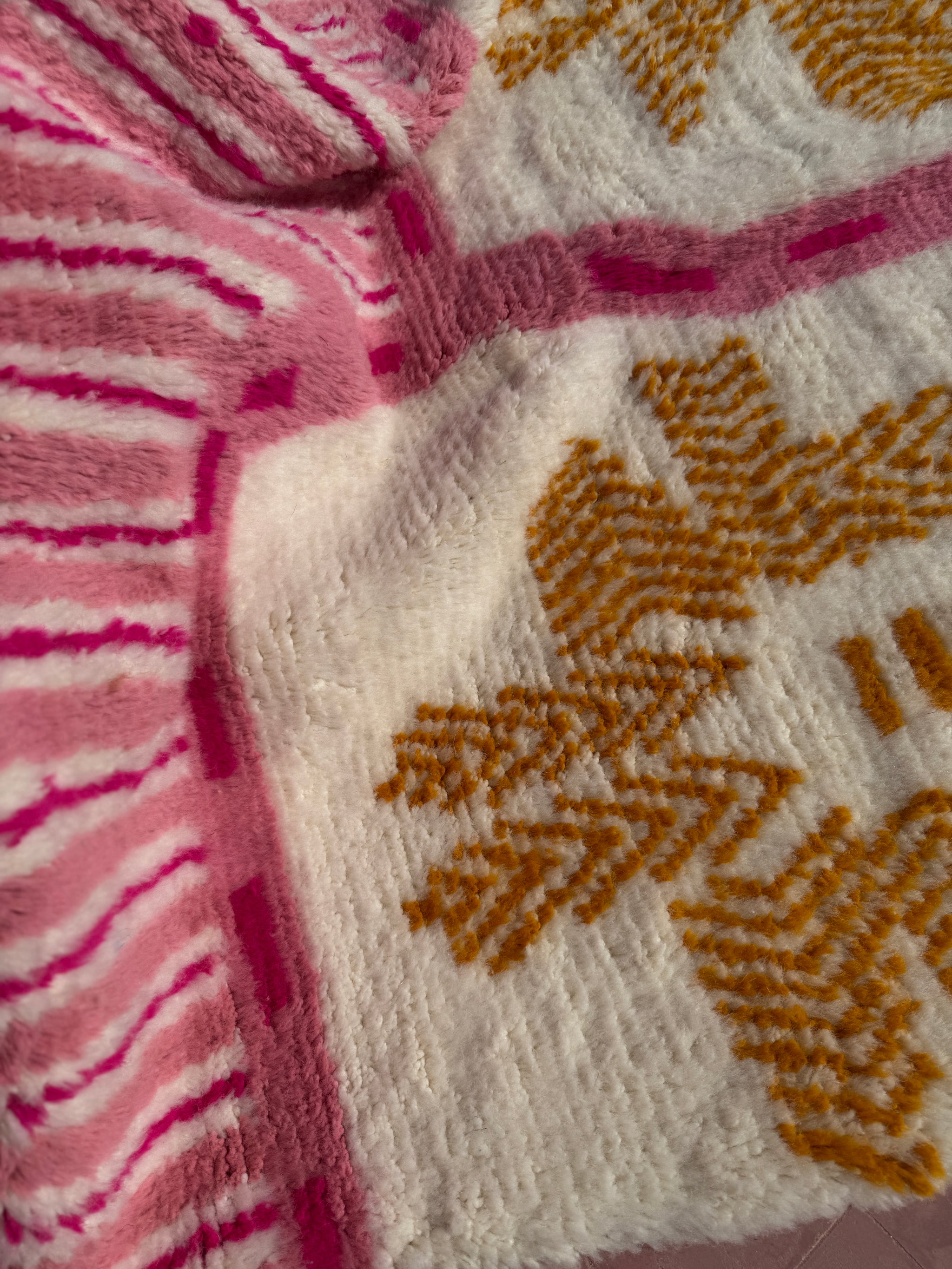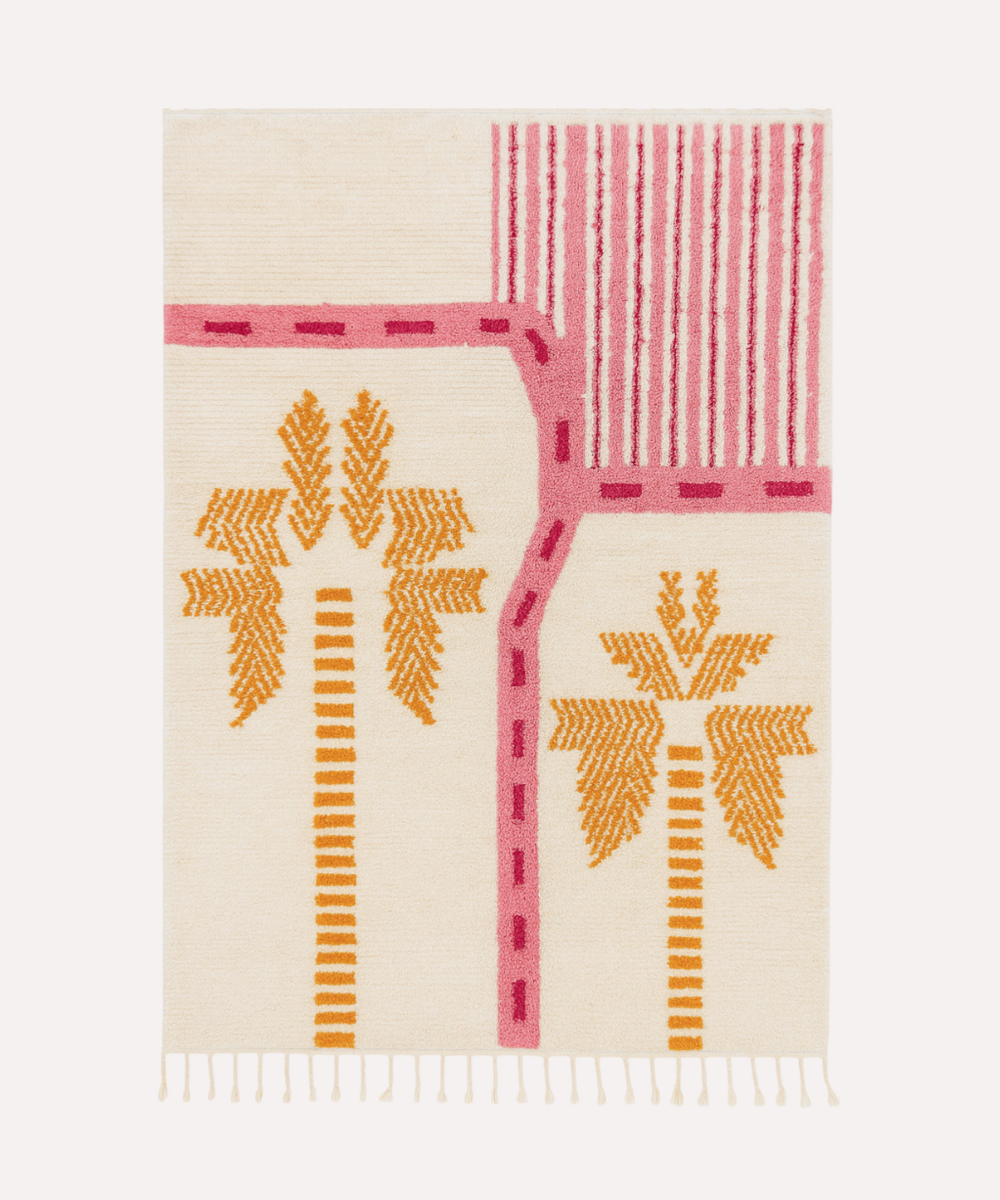 Safa brengt een moderne knipoog naar de woestijn met zijn palmmotieven in warme oranje tinten. De frisse combinatie van roze en wit geeft het ontwerp een eigentijdse en vrolijke uitstraling. De zachte wol voelt aangenaam en geeft je interieur een lichte en luchtige sfeer. Met Safa haal je een stukje zonnige Marokkaanse energie in huis.