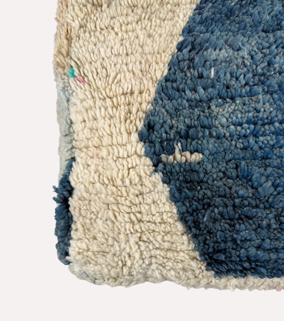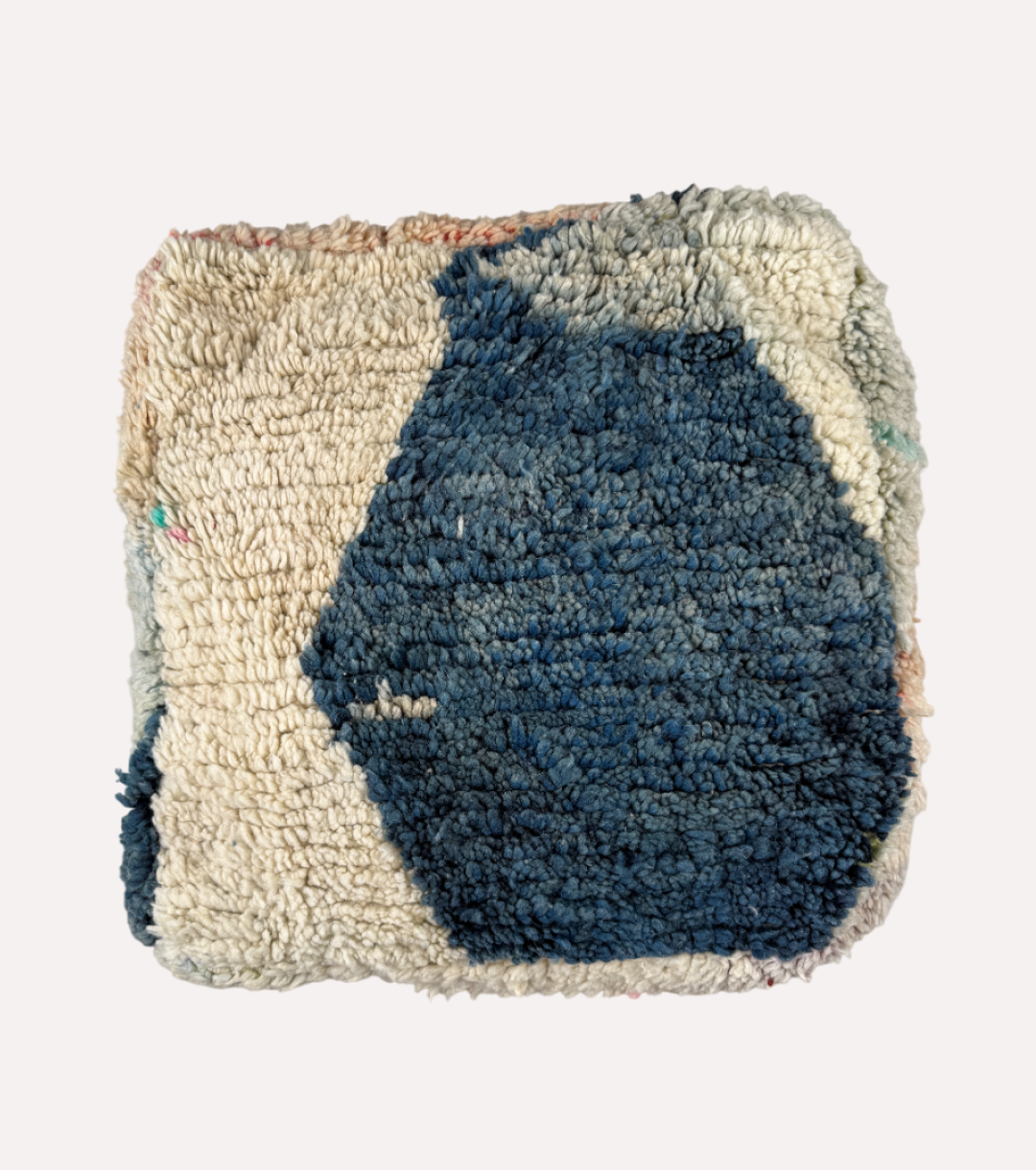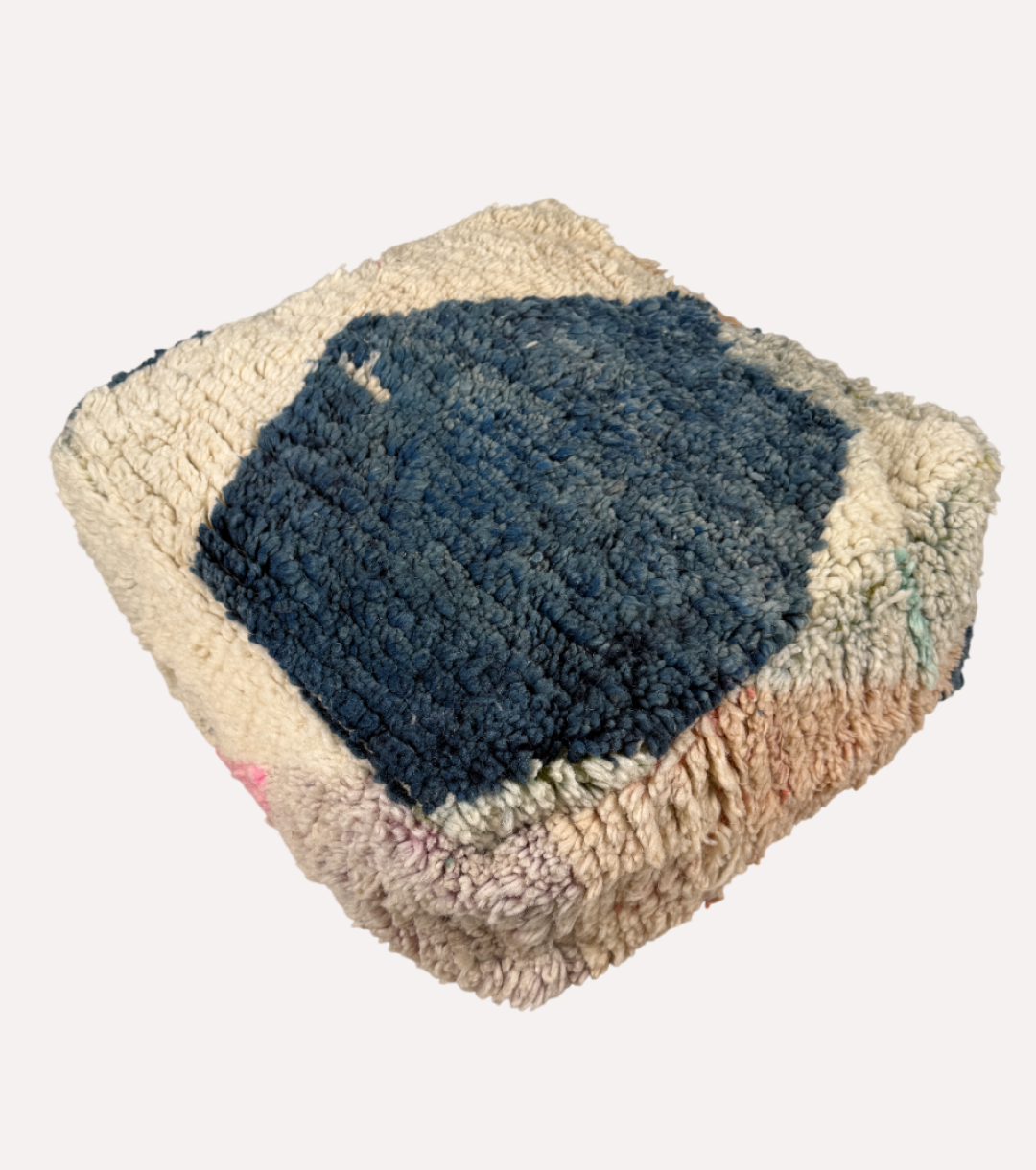 Zacht, stoer en een tikje eigenwijs – deze Marokkaanse poef is gemaakt van een vintage Boucherouite tapijt en heeft karakter met hoofdletter K. Denk: diepe blauwtinten, fluffy textuur en een speelse vorm in het midden die meteen de aandacht trekt.